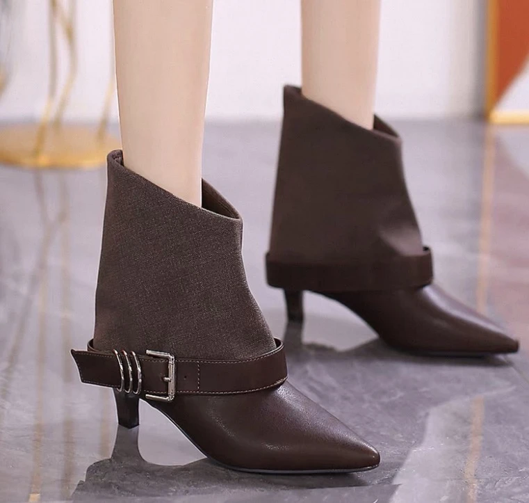 Women's ankle boots with a 5cm pointed toe, a new design for this fall and winter season. Stylish stiletto heels with a strap buckle. Elegant and versatile shoes.