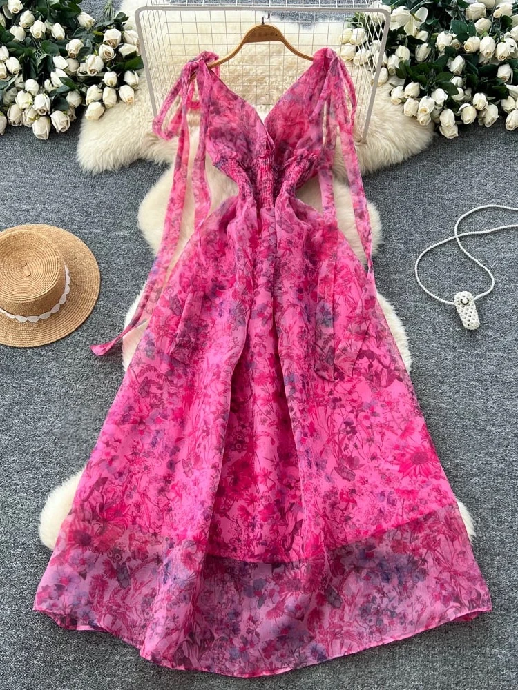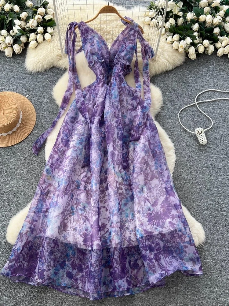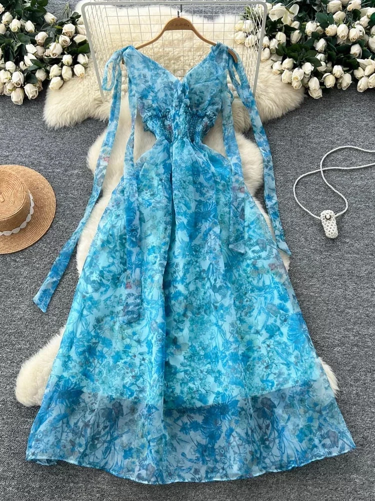 An elegant and sophisticated French-style dress, adorned with a bow tie, defined waist, and floral print; and a long, elegant skirt of flowing tulle.