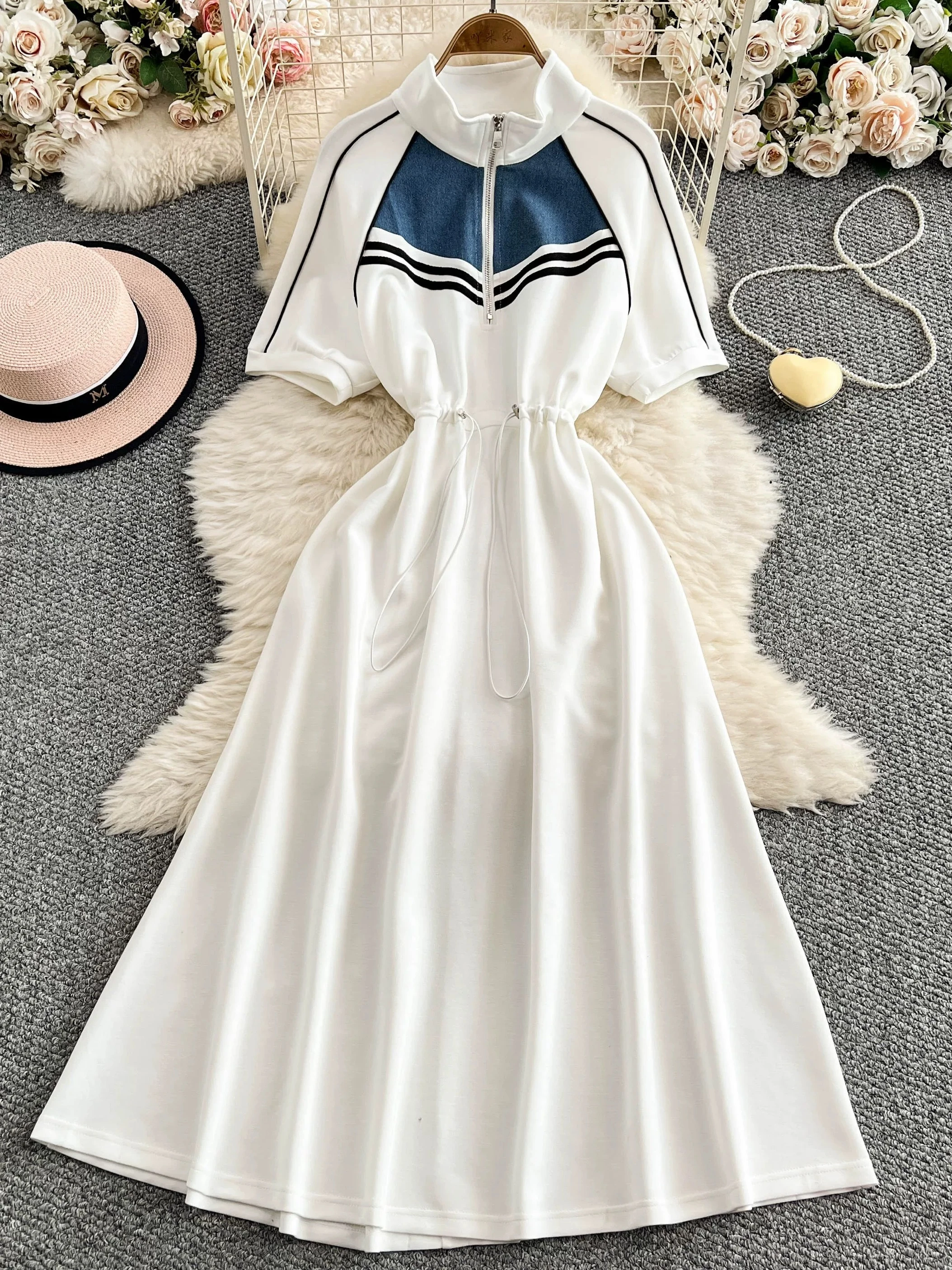 Half-zip sweatshirt dress with a high French-style collar, new summer design, drawstring waist, elegant design, wide skirt, mid-length.