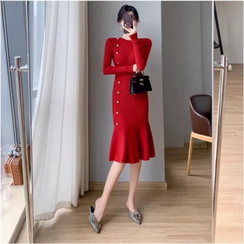 This unique and beautiful fishtail skirt for women is suitable for autumn and winter. It features a light and delicate elegance, in a stylish and appropriate French style. It's a white knit dress with a fitted waist.