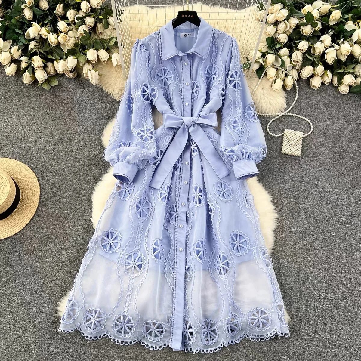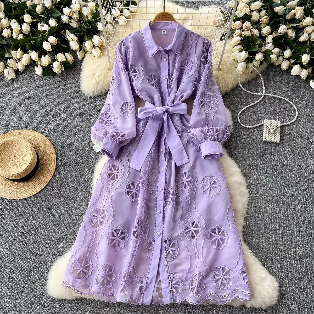 A dress with a flared skirt, wide sleeves, a folded collar, and a defined waist, exudes sophistication and elegance. It features a single-breasted design and embroidered details.