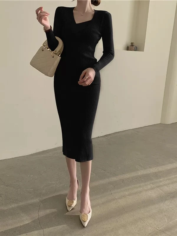 A classic French-style long dress that falls above the knee, with a tight cut, a tight knitted dress for women, suitable for autumn and winter.