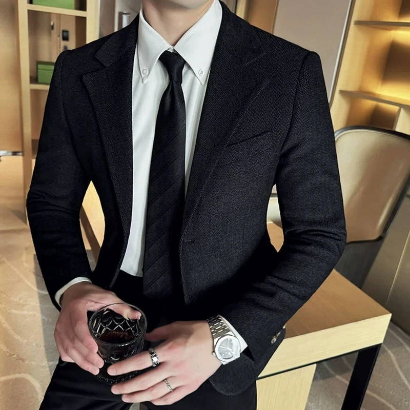 A luxurious and thick men's suit jacket, in the Korean style, with a slim fit, suitable for casual looks, a new design for autumn/winter, with a herringbone pattern, a modern men's suit.