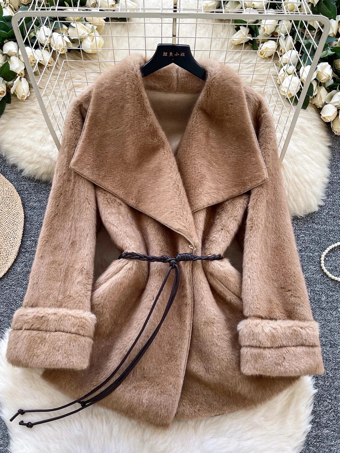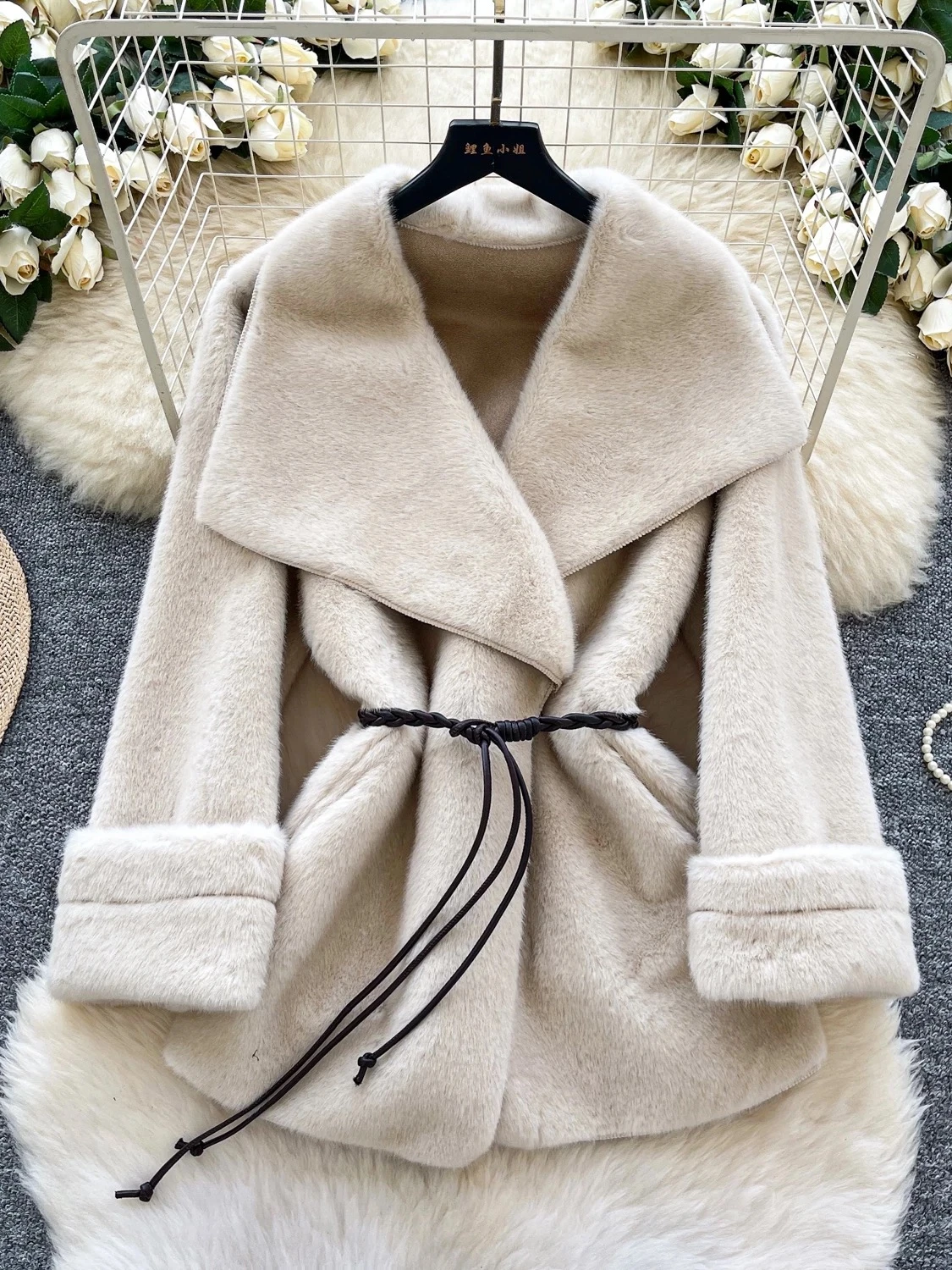 Elegant and modern V-neck with a large lapel, women's winter 2025 style, sophisticated feel, drawstring waist, luxurious coat.