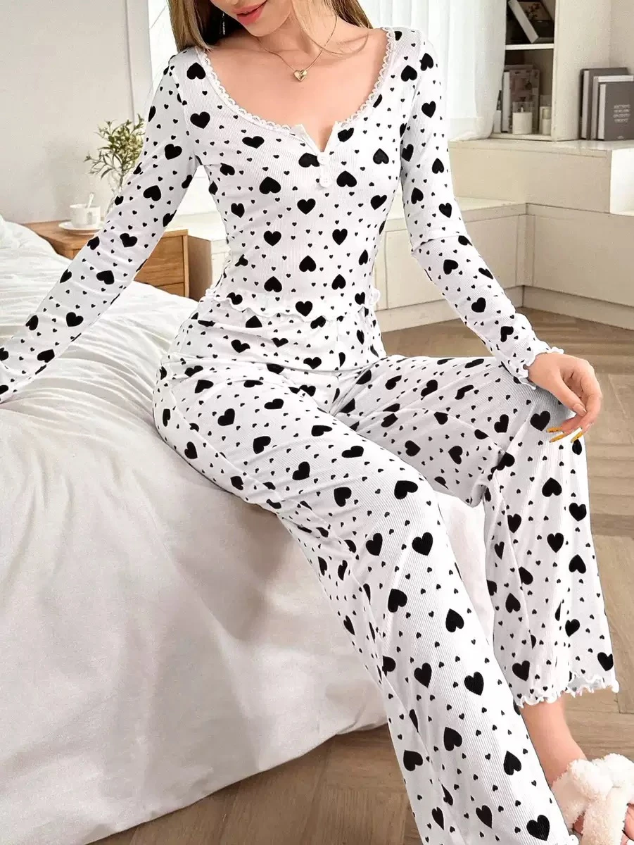 New versatile pajama set with a heart print, long sleeves and long legs, suitable for wearing outside the home, women's pajamas in European and American style.