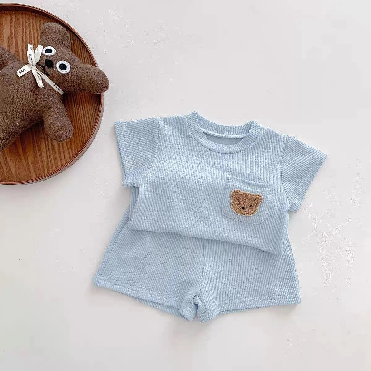 Summer shorts set for children with short sleeves, decorated with a waffle knit bear design, comfortable and lightweight.