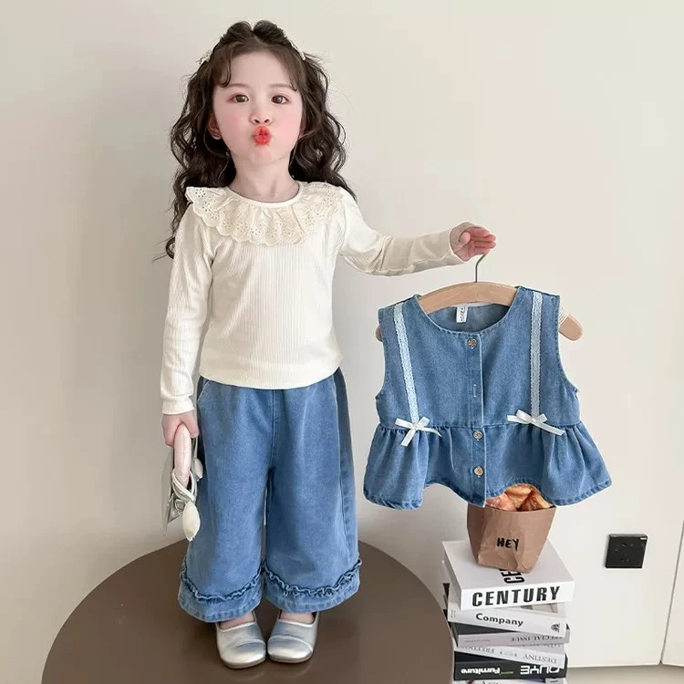 Girls' Spring and Autumn Outfit: Stylish and Fashionable Outfit for Baby Girls - Denim Vest Three-Piece Set