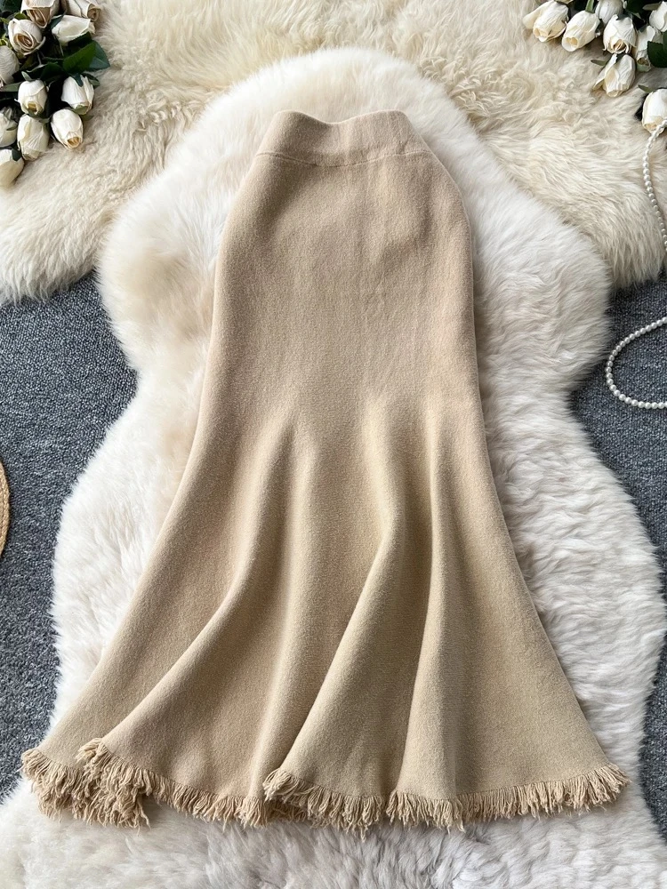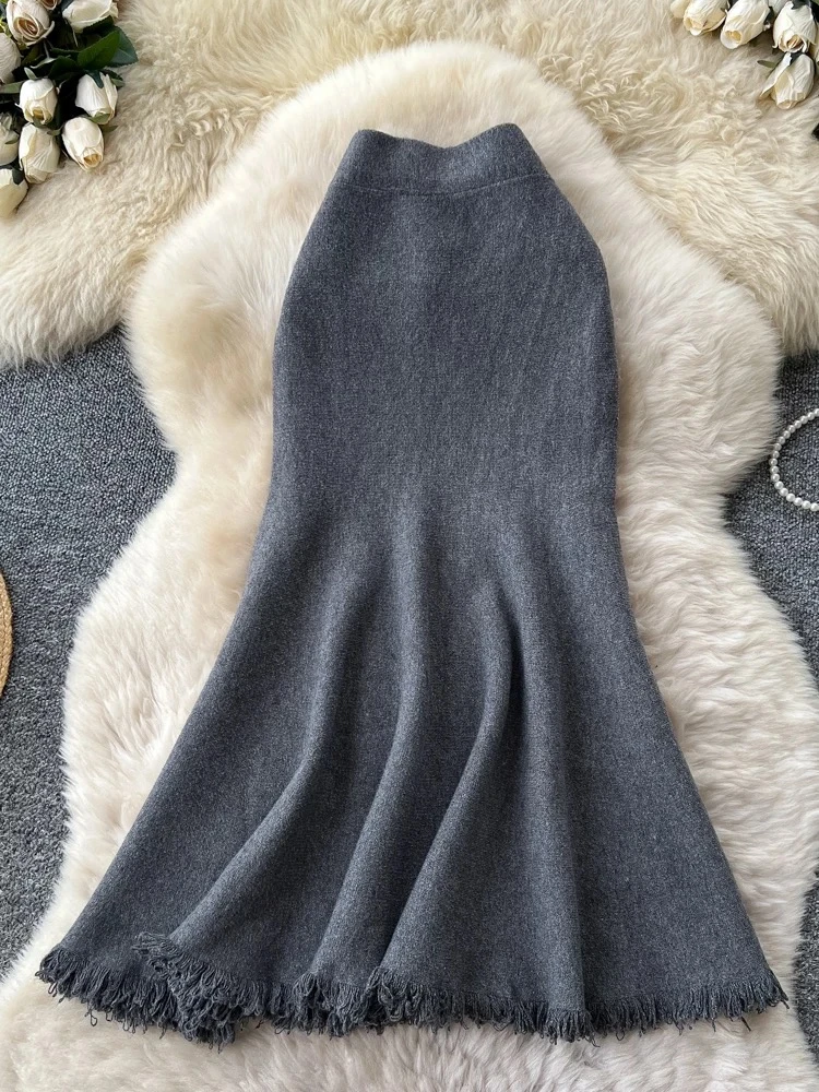 Versatile high-waisted French-style midi skirt, new autumn/winter style, sophisticated, slim, flattering, fishtail knit skirt with tassel.