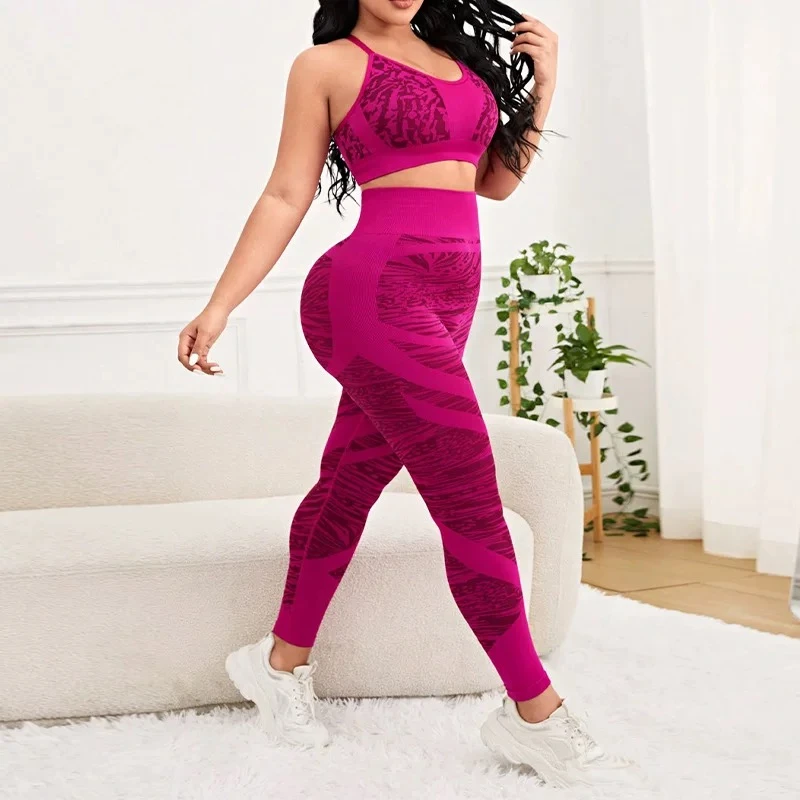 Two-piece women's sportswear set, European and American design, shock-resistant, suitable for yoga and running, with seamless sports pants to lift the hips.