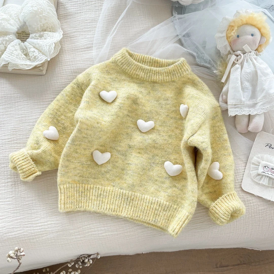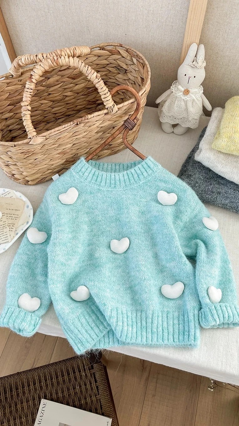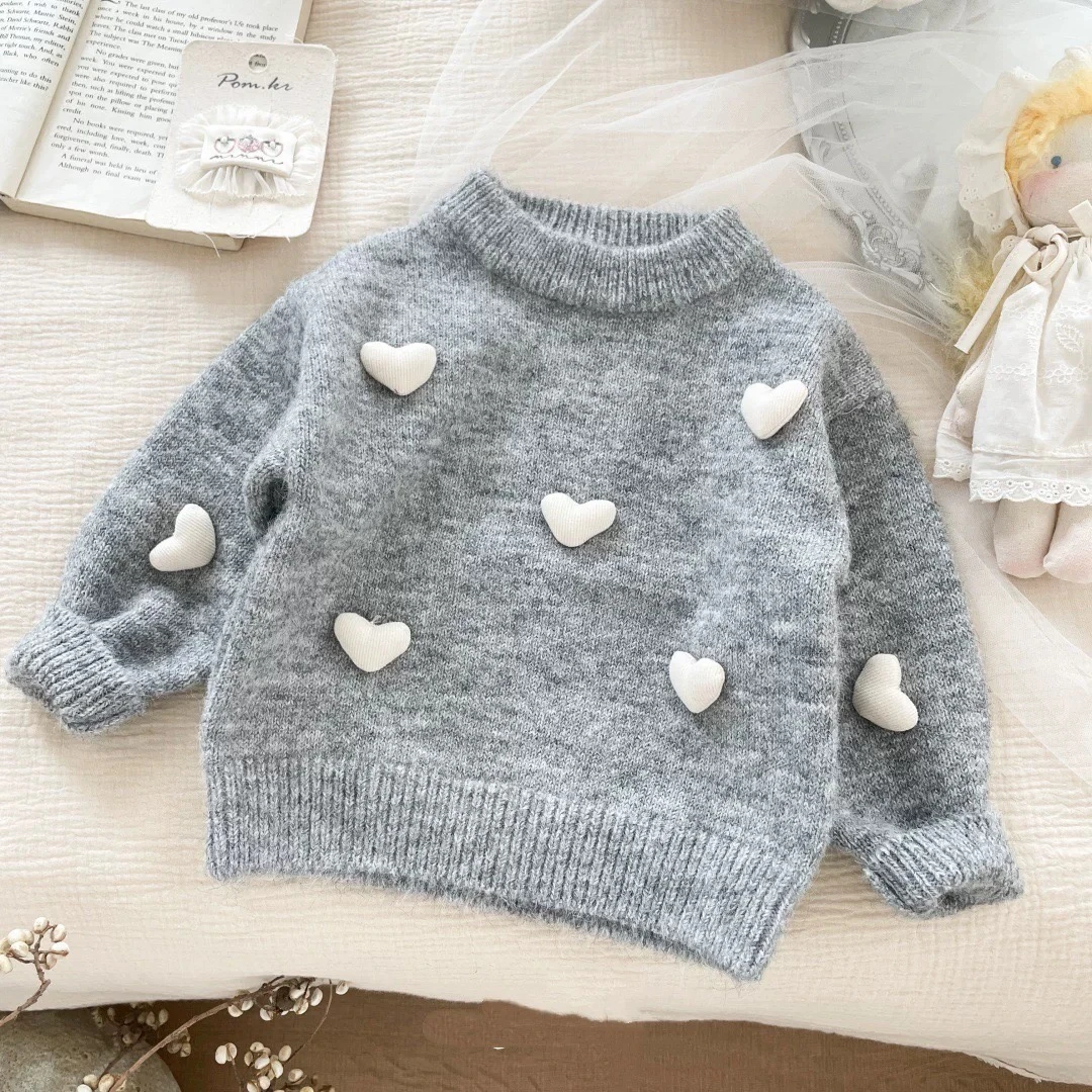 Girls' Sweater, 3D Heart Knit Sweater, Round Neck, Autumn and Winter Top