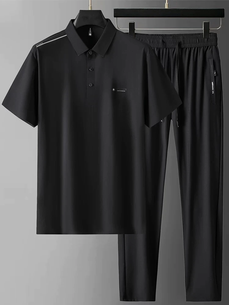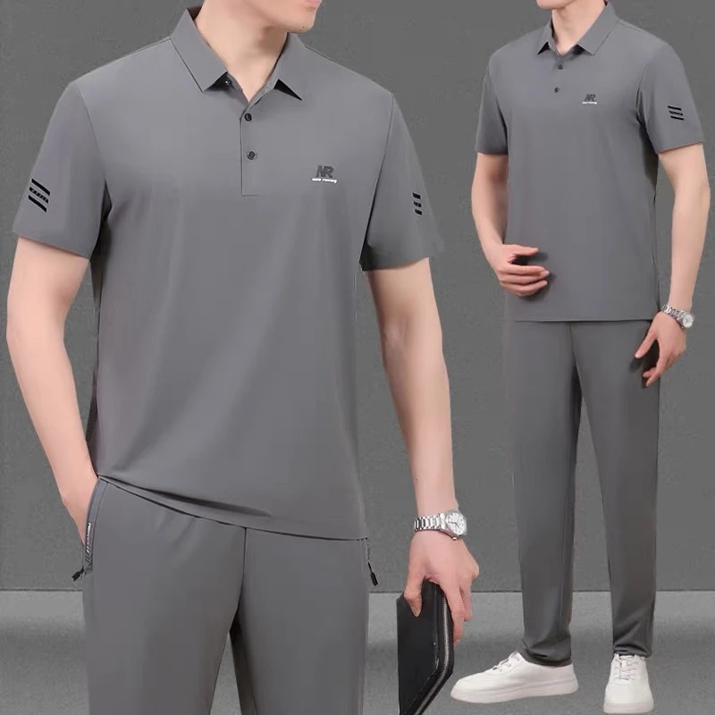 Men's casual summer sportswear set, short-sleeved t-shirt, luxury matching set for middle-aged men, made of ice silk.