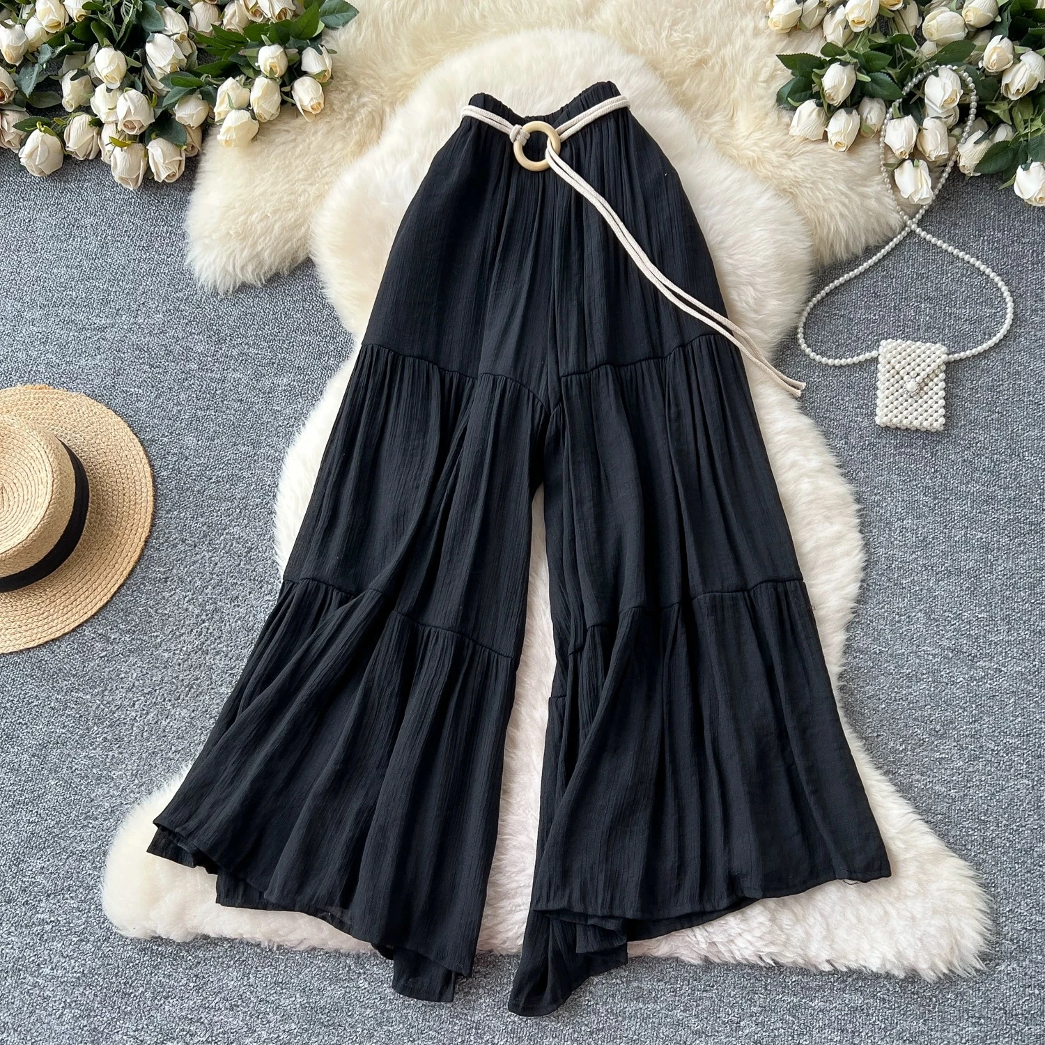 Comfortable summer trousers, with a delicate and soft design, versatile with a high waist and a wide, loose fit, concealing imperfections and flattering the hips; chiffon trousers.