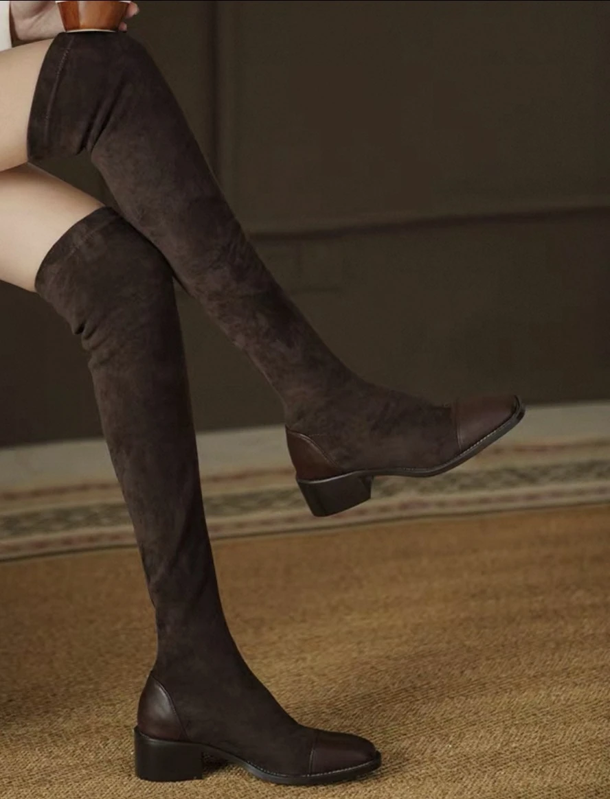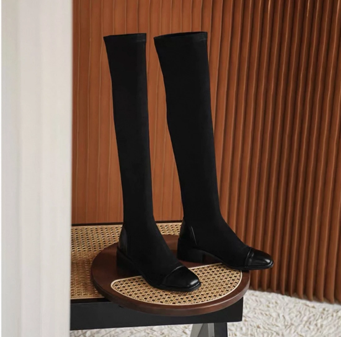 Fashionable over-the-knee boots, stylish and slimming, patchwork riding boots with a thick heel, large sizes, rubber boots for women