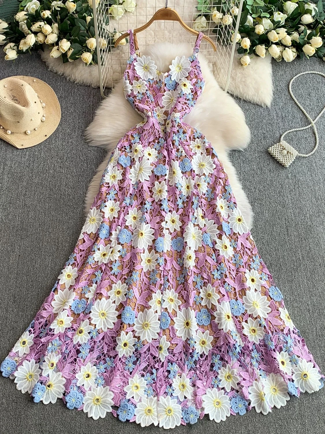 A luxurious women's summer dress, inspired by the atmosphere of French resorts, featuring a unique and beautiful open floral lace design, is an elegant long dress that highlights the beauty of the figure.