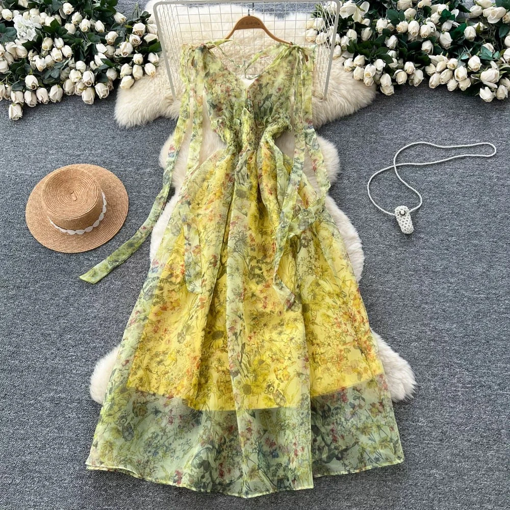An elegant and sophisticated French-style dress, adorned with a bow tie, defined waist, and floral print; and a long, elegant skirt of flowing tulle.