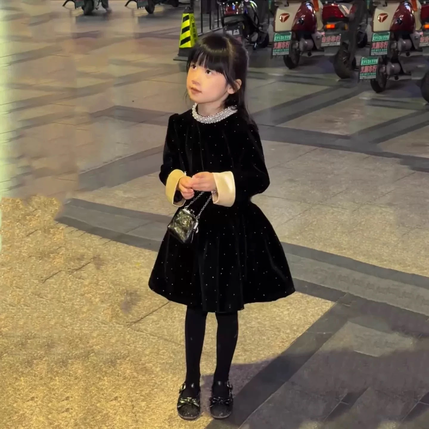 Original Girls' Sparkling Velvet Dress with Rhinestones, Little Girl's Pearl Collar Puffy Princess Dress