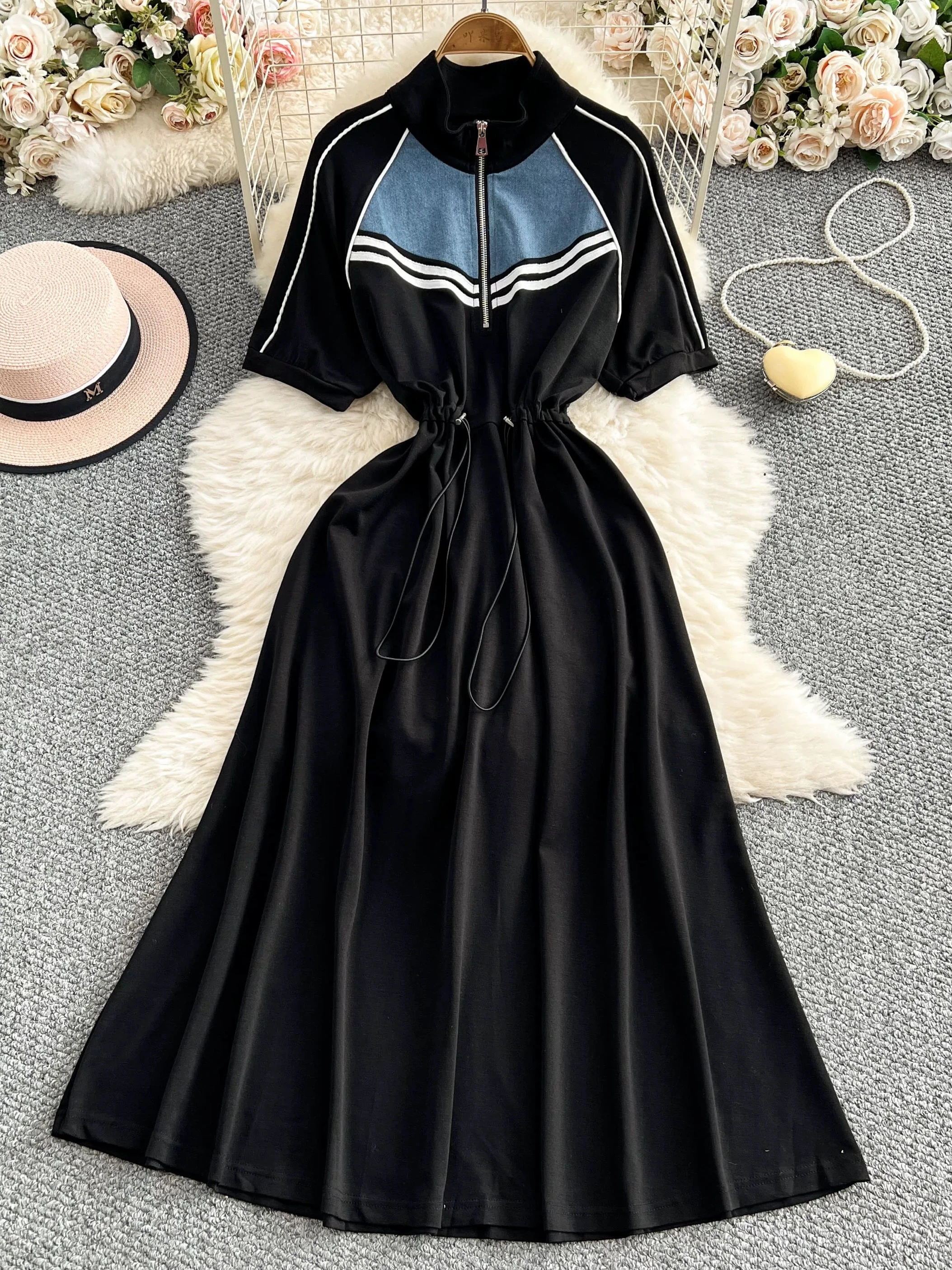 Half-zip sweatshirt dress with a high French-style collar, new summer design, drawstring waist, elegant design, wide skirt, mid-length.