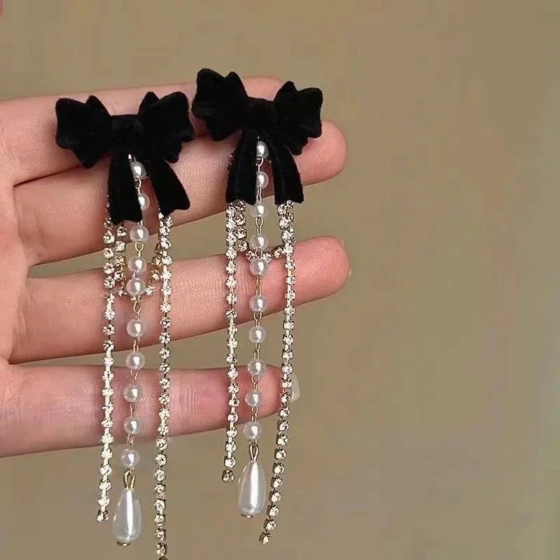 Luxurious and elegant long earrings for brides, adorned with a pearl tassel in the shape of a bow, in a velvety burgundy color