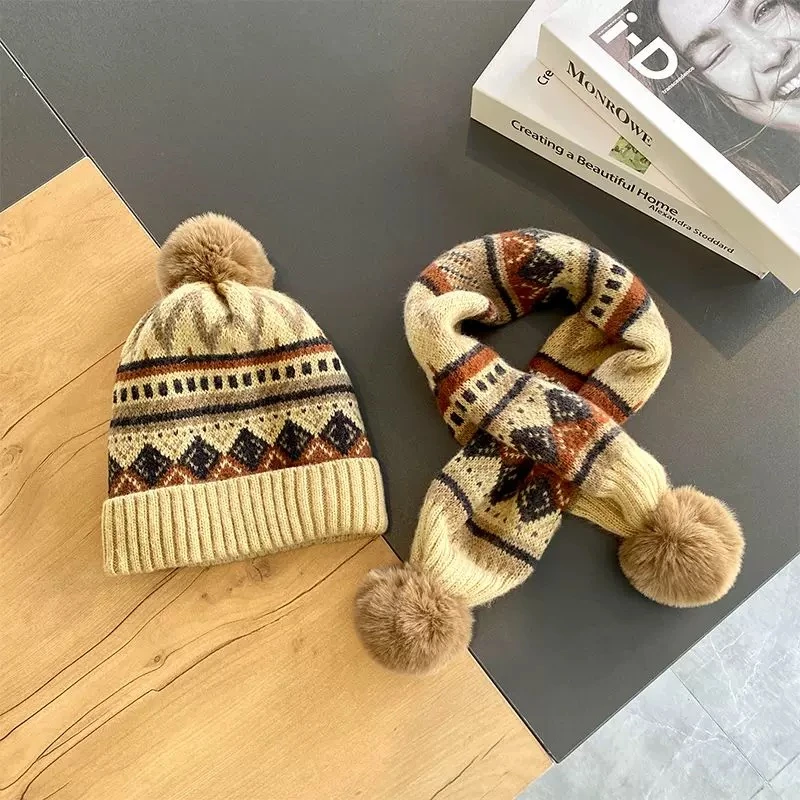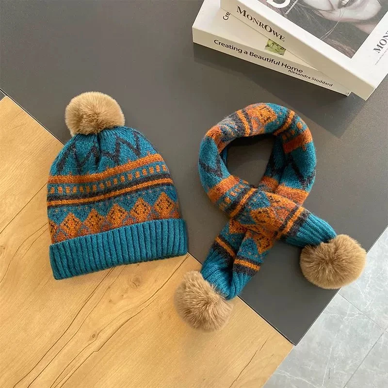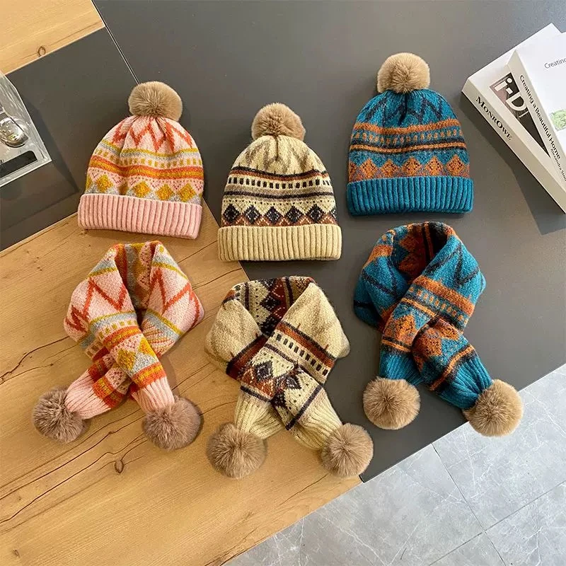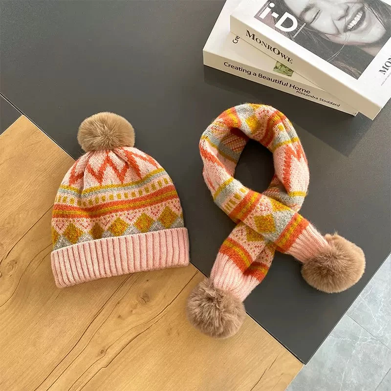 Children's hat and scarf two-piece set, new autumn and winter style, warm, windproof, fleece-lined knitted hat and neck warmer, fashionable Korean style.