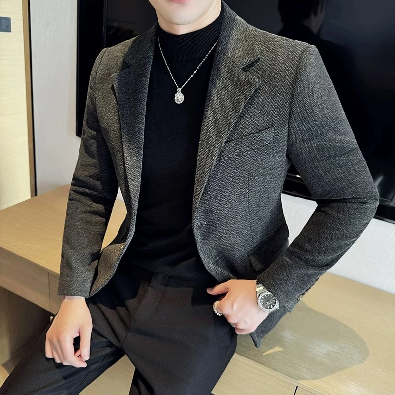A luxurious and thick men's suit jacket, in the Korean style, with a slim fit, suitable for casual looks, a new design for autumn/winter, with a herringbone pattern, a modern men's suit.