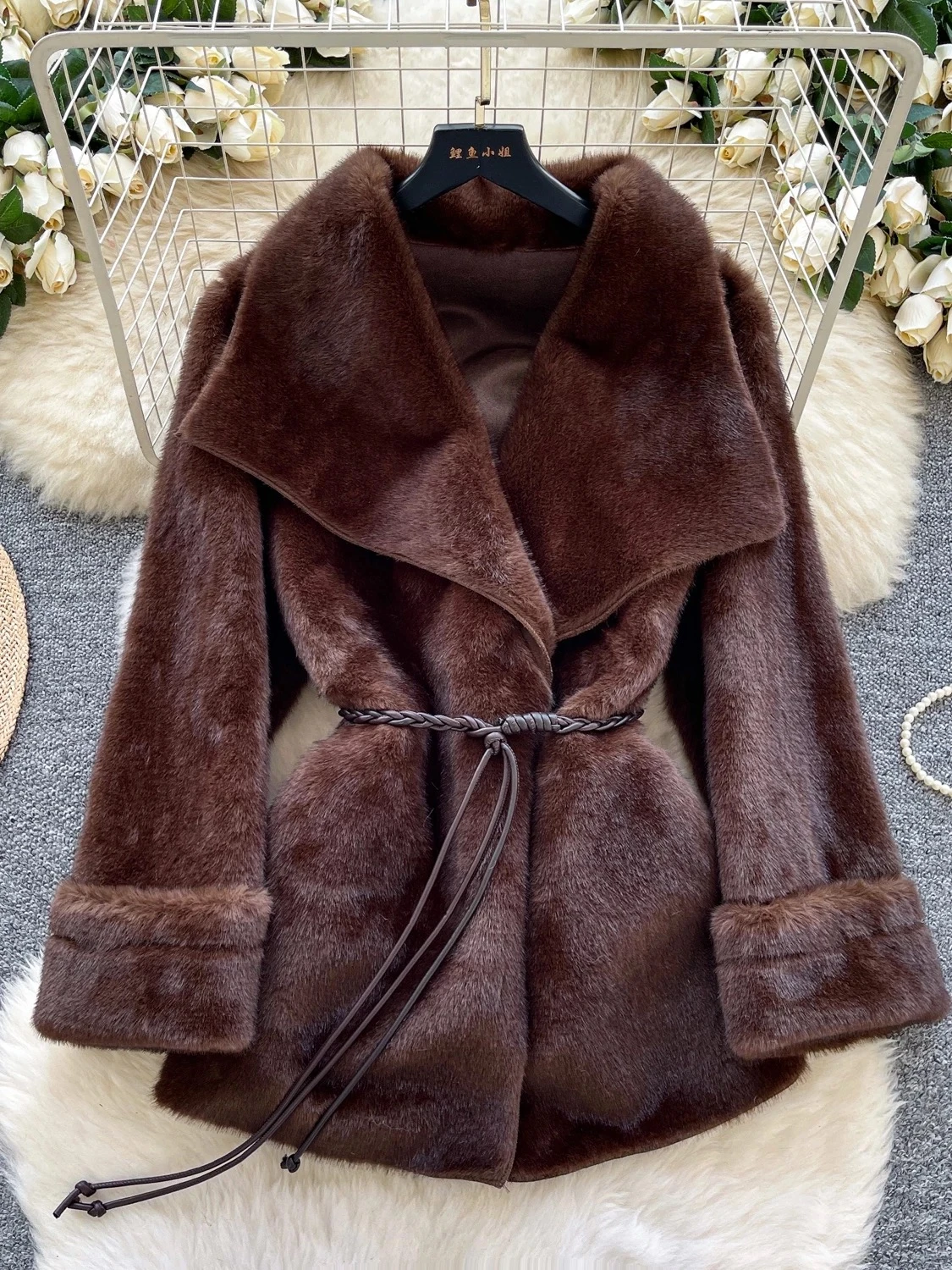 Elegant and modern V-neck with a large lapel, women's winter 2025 style, sophisticated feel, drawstring waist, luxurious coat.