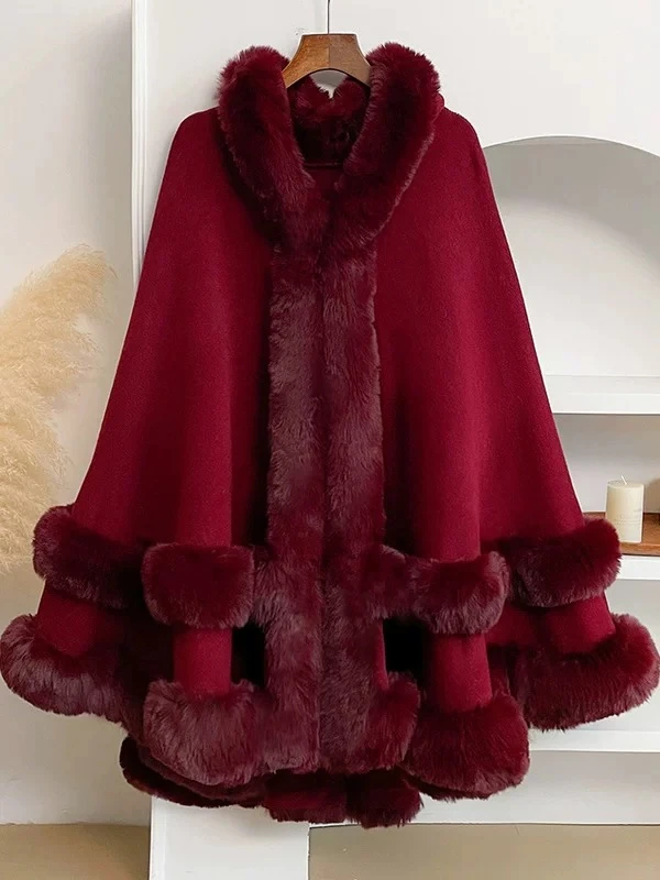 Red wool coat with a fur collar, new design, mid-length wool coat with a waist-defining belt.