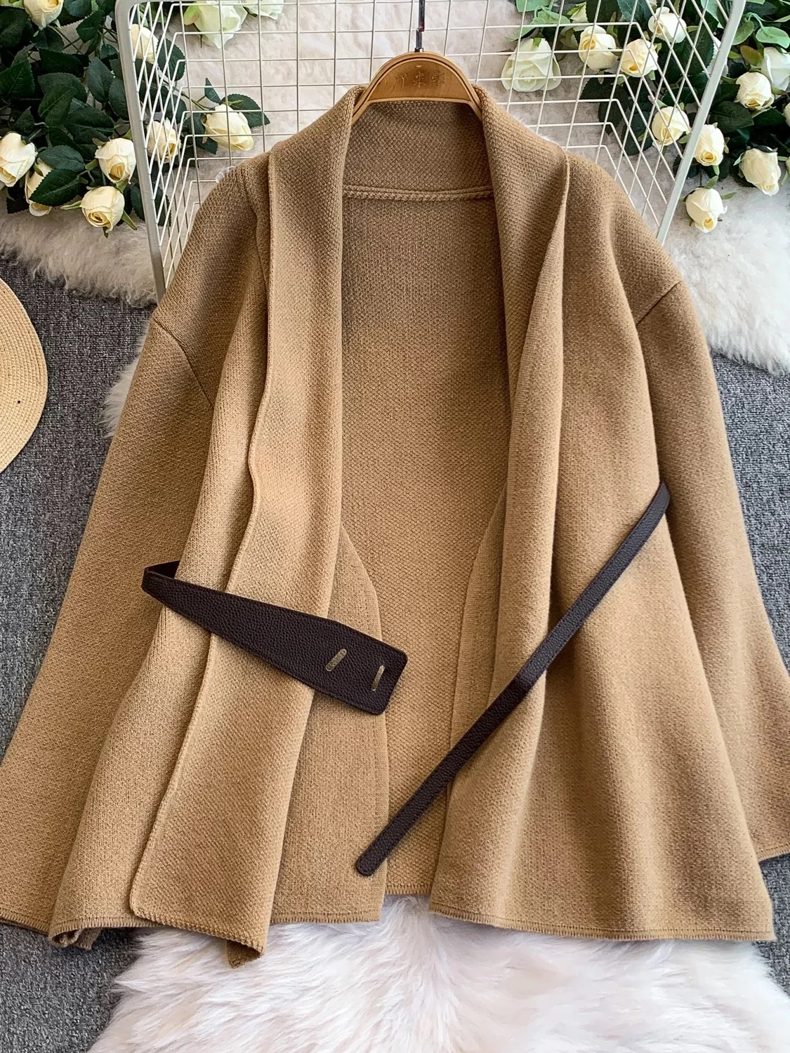A mid-length wool coat with a dropped neck, shawl, and fitted waist, in a stylish and modern European and American design, new style 2025.