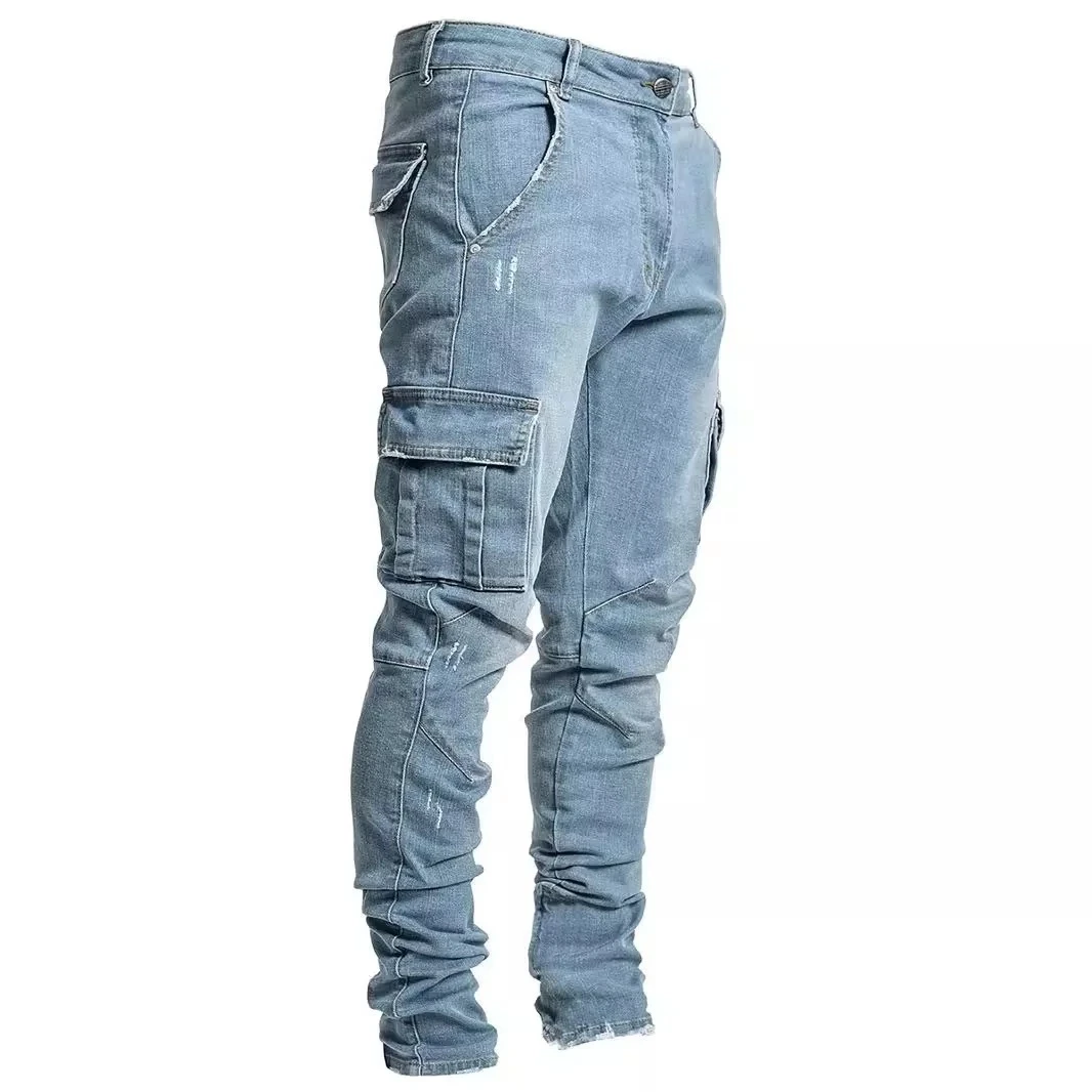 New men's summer jeans with a European and American design, featuring side pockets, a slim fit, and an American style.