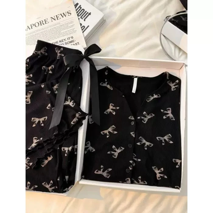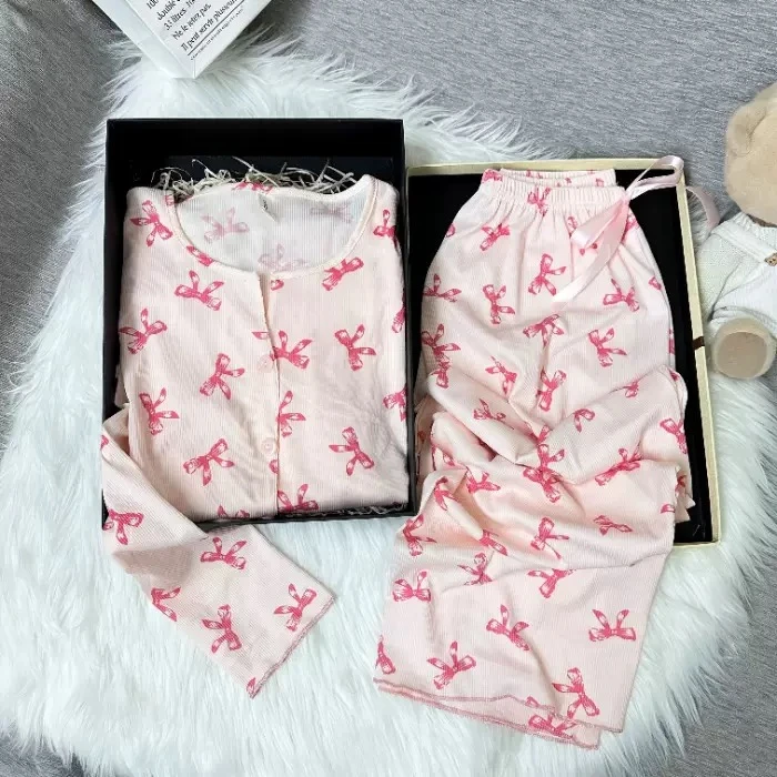 New women's ribbed ice silk pajamas, pink, decorated with a bow, long sleeves and V-neck, with cute cartoon prints, suitable for spring and autumn.