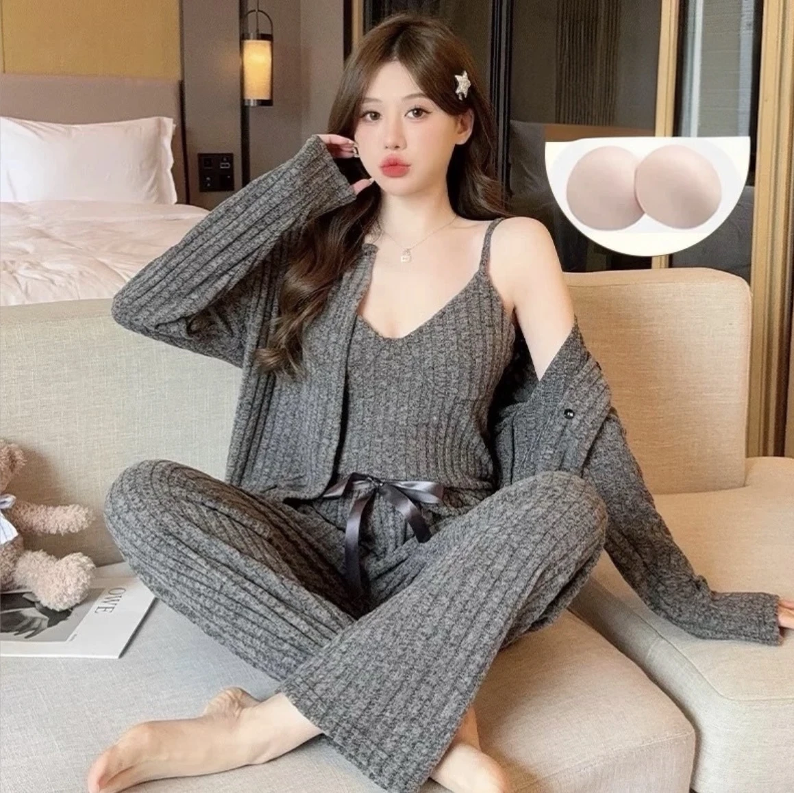 Sexy women's three-piece autumn/winter pajama set with long sleeves and bust padding; soft rayon fabric perfect for lounging at home.