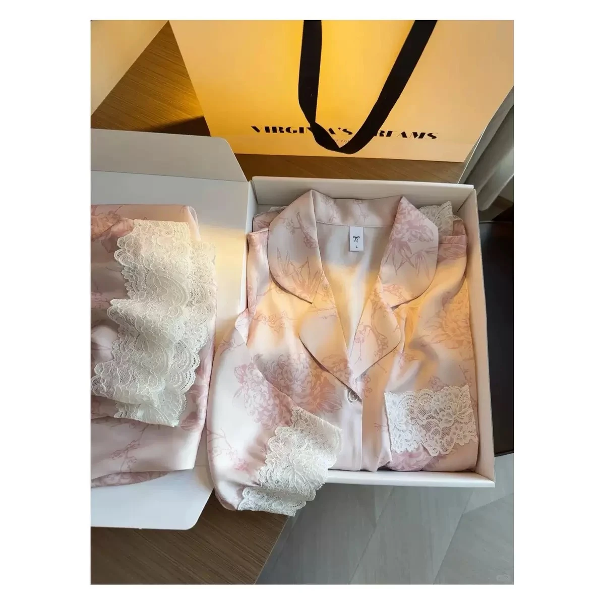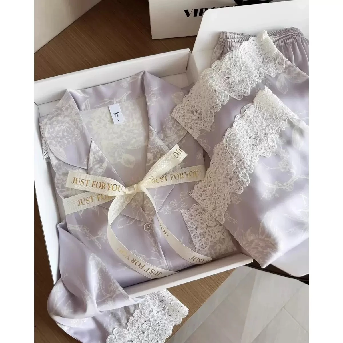 Women's pajamas in soft satin silk, decorated with luxurious French-style lace; a new loungewear set for this spring and summer in a nude color.