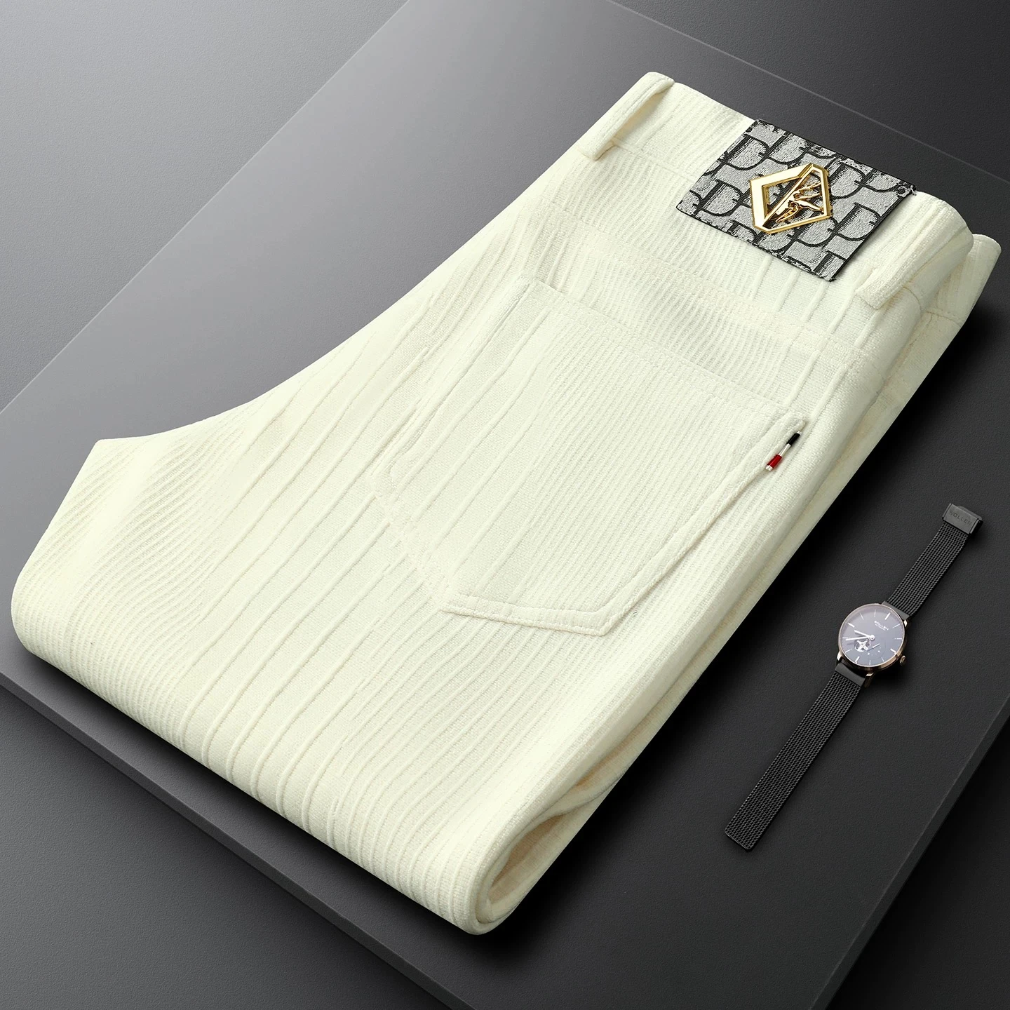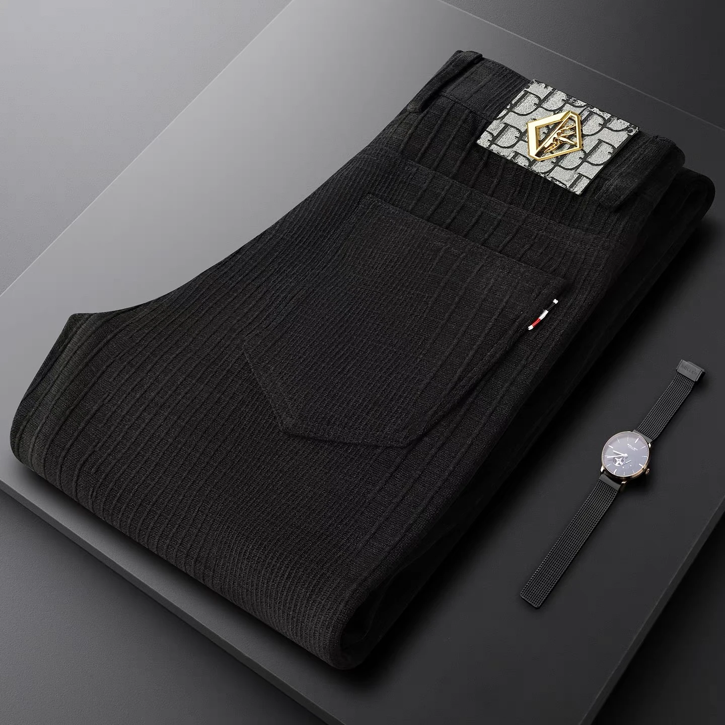 Stylish black men's trousers with a simple yet luxurious design, suitable for work and casual occasions, with a slim, straight cut, made from thick fabric.