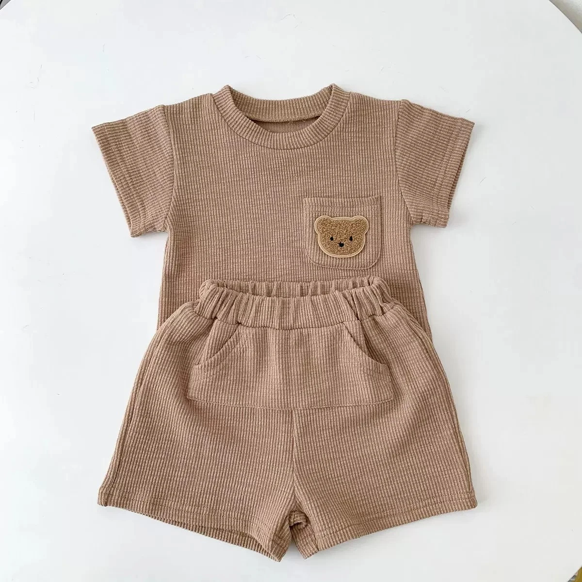 Summer shorts set for children with short sleeves, decorated with a waffle knit bear design, comfortable and lightweight.