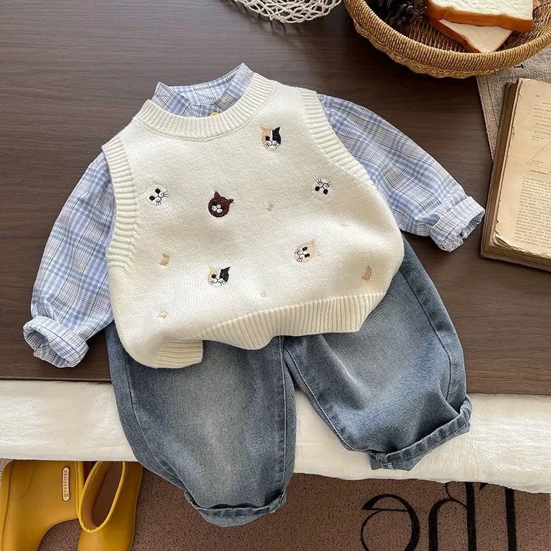 Boys' Stylish Three-Piece Set (Sweater, Vest, Shirt, Jeans)