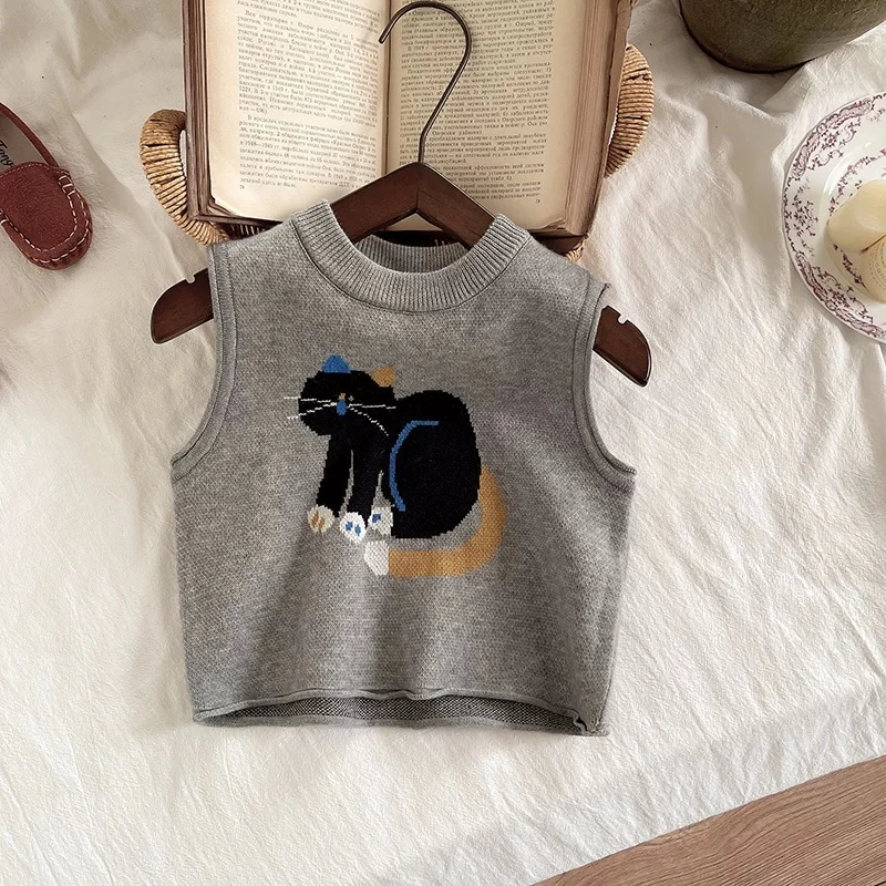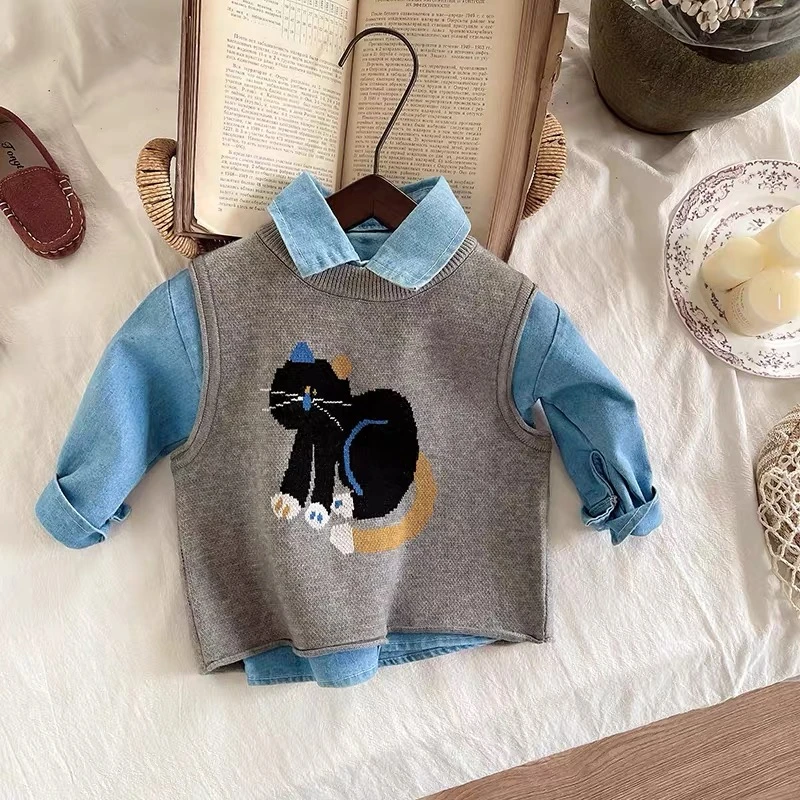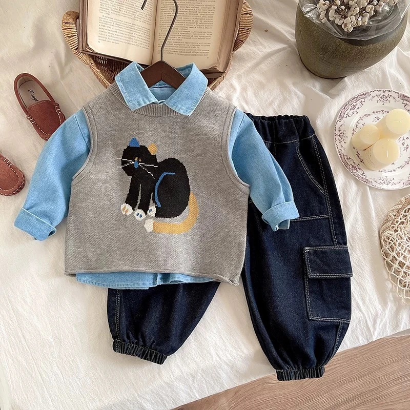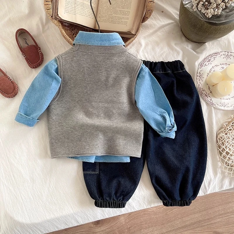 children's set, stylish and fashionable children's vest sweater and denim shirt, baby three-piece set.