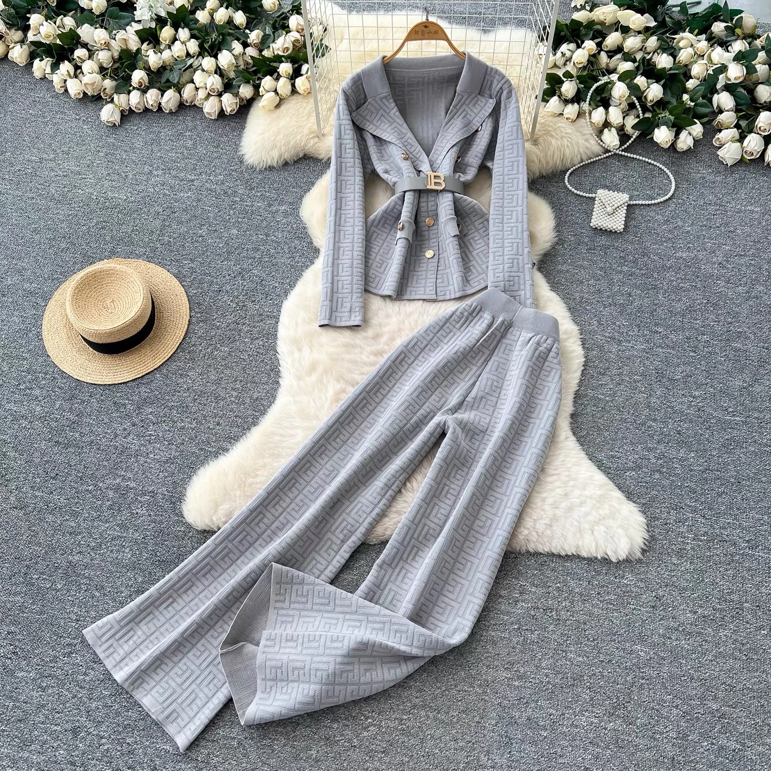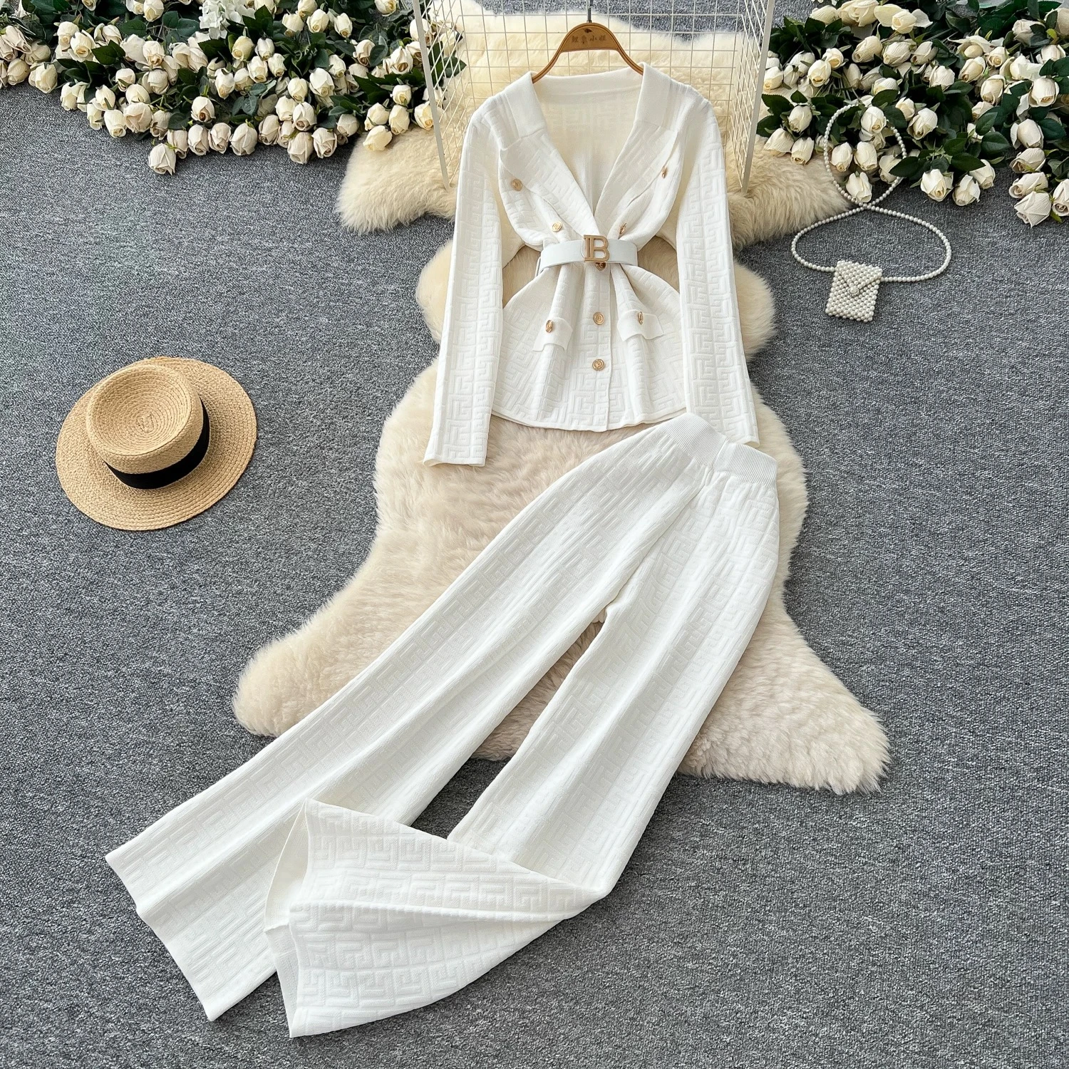 Elegant European-style outfit: a stylish and sophisticated knitted blouse with long sleeves, a belt at the waist, and wide-legged pants with a high waist.