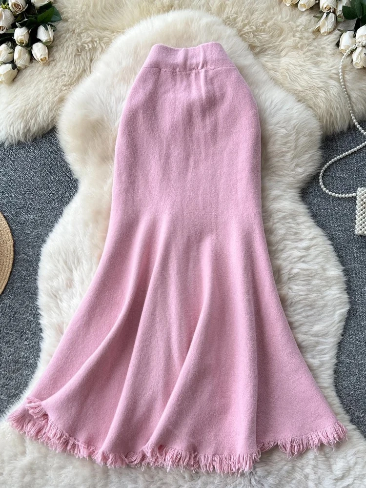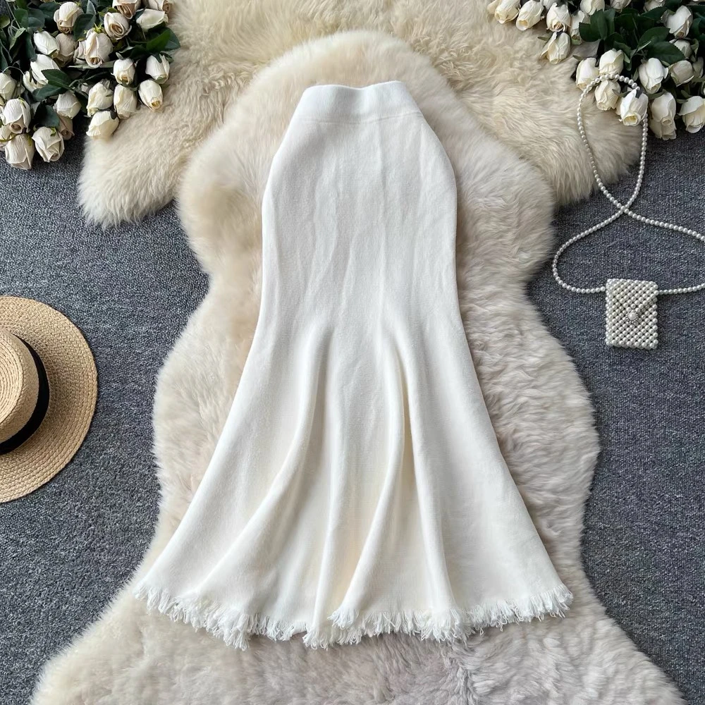 Versatile high-waisted French-style midi skirt, new autumn/winter style, sophisticated, slim, flattering, fishtail knit skirt with tassel.