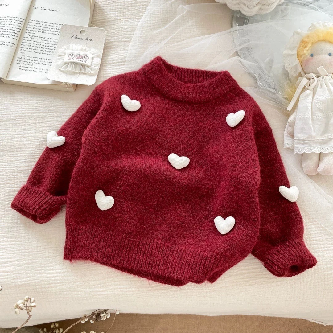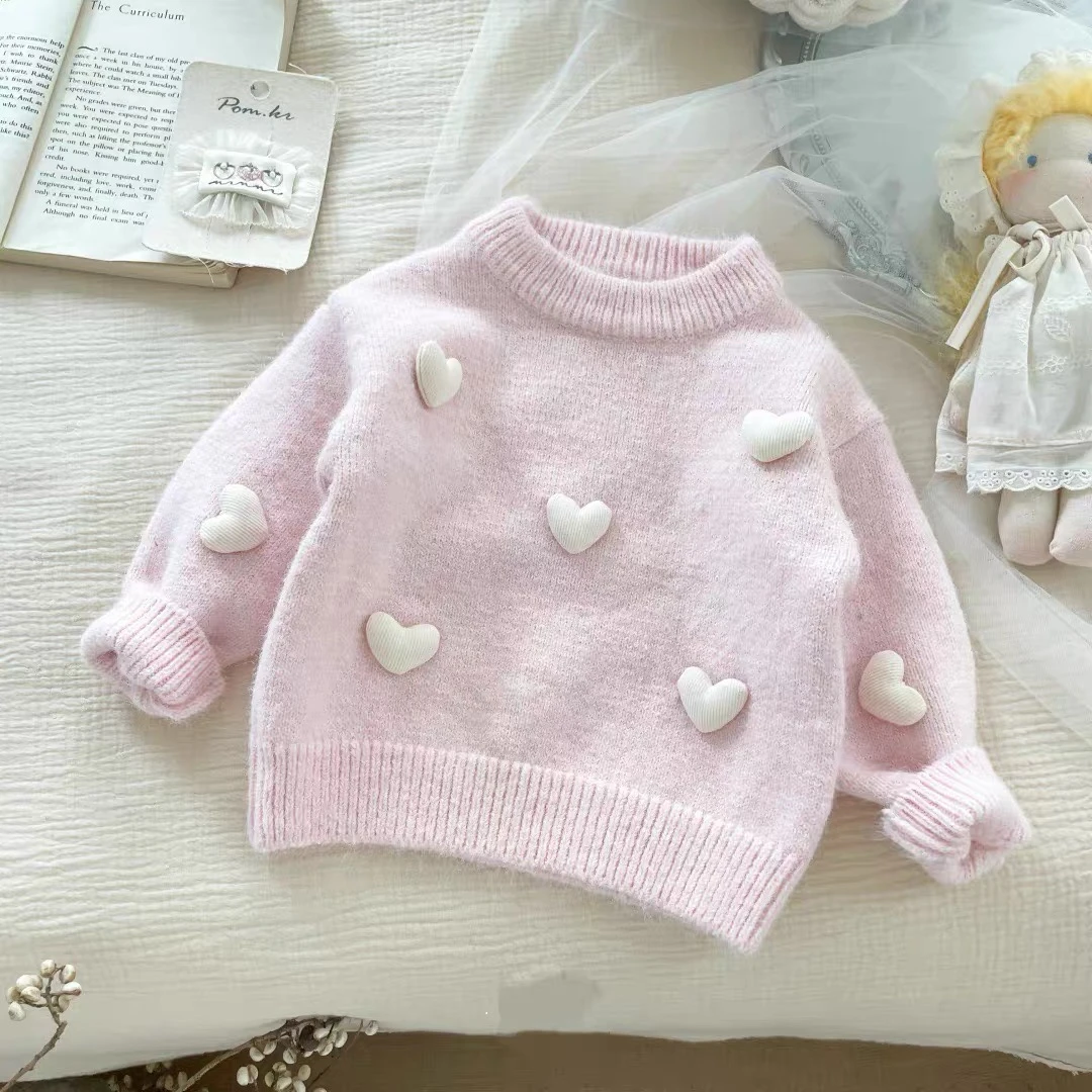 Girls' Sweater, 3D Heart Knit Sweater, Round Neck, Autumn and Winter Top