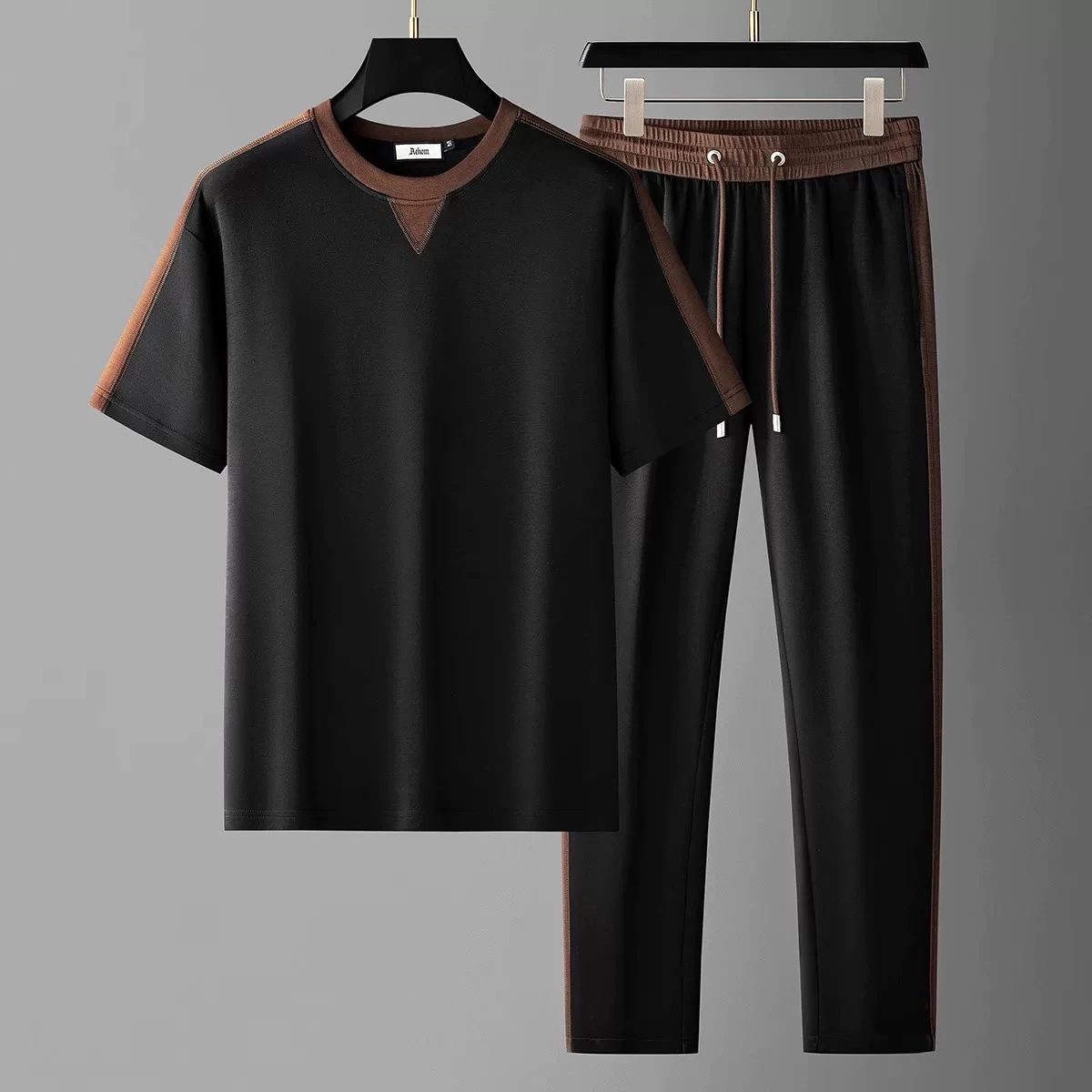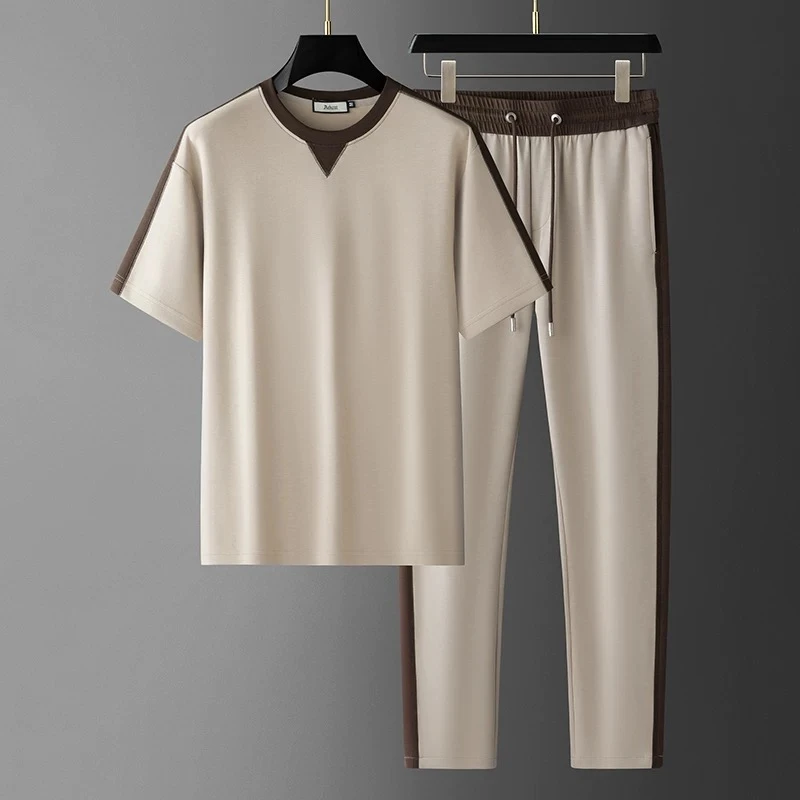 A luxurious summer suit with a round neck and short sleeves adorned with woven ribbons; a men's tracksuit made of soft, stretchy, and breathable ice silk.