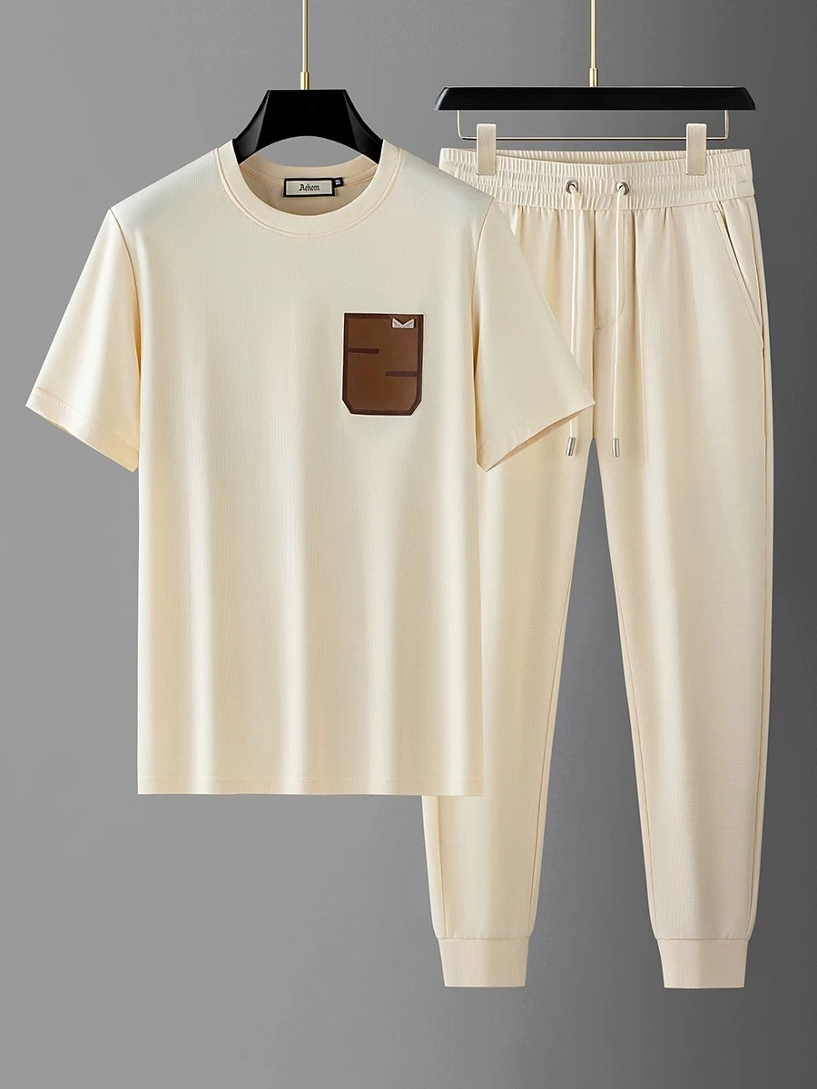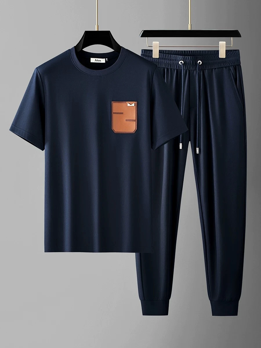 Luxury two-piece summer tracksuit, with a leather patchwork design, ice silk pockets, waffle weave fabric, short sleeves, suitable for men.