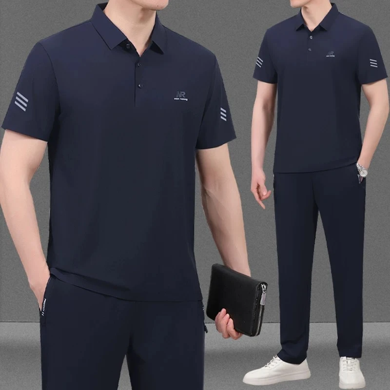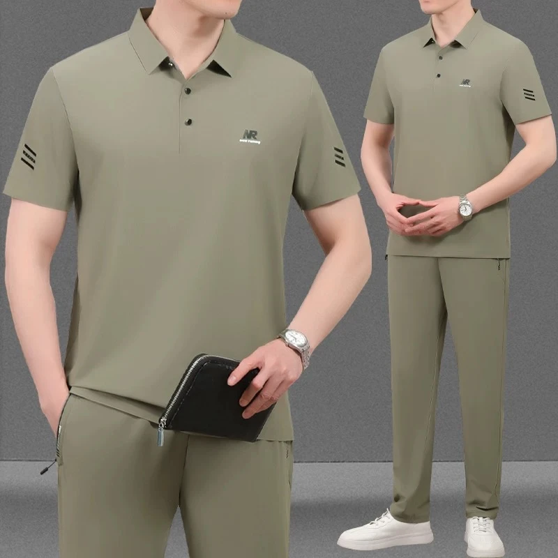 Men's casual summer sportswear set, short-sleeved t-shirt, luxury matching set for middle-aged men, made of ice silk.