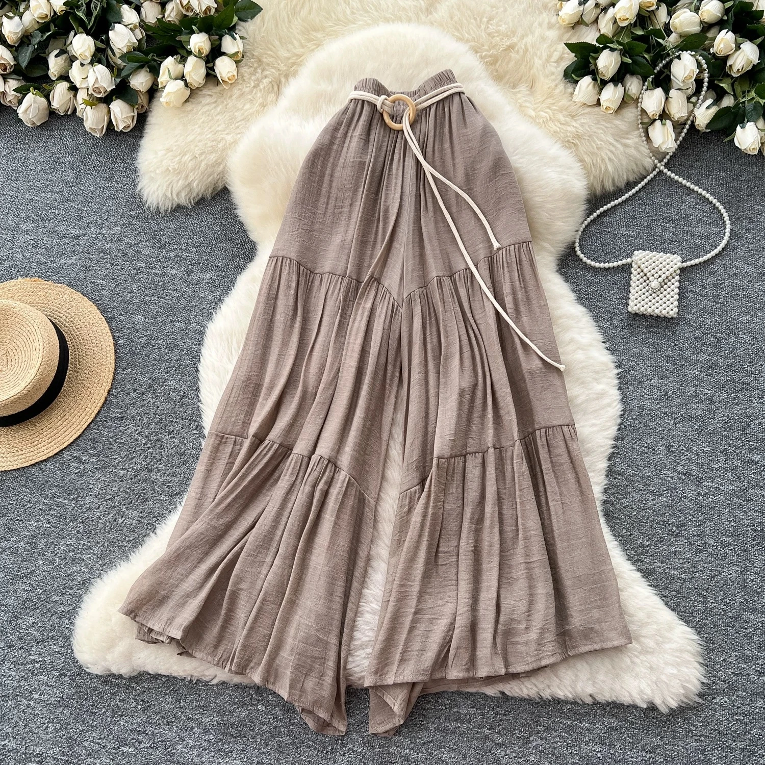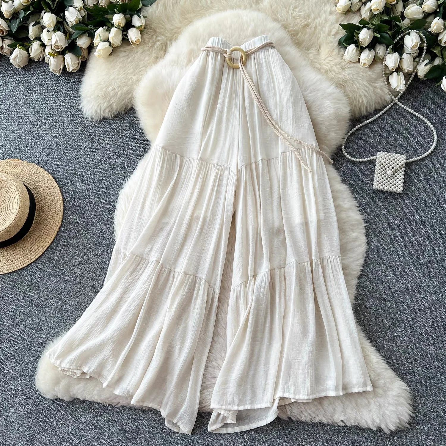 Comfortable summer trousers, with a delicate and soft design, versatile with a high waist and a wide, loose fit, concealing imperfections and flattering the hips; chiffon trousers.