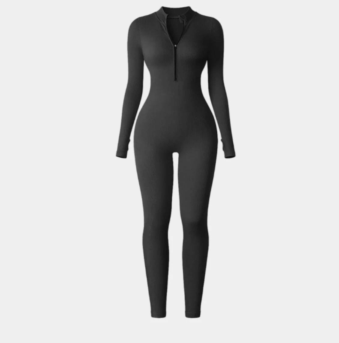 Stylish women's jumpsuit in a European and American style, suitable for autumn and winter, featuring a zipper, high neck, long sleeves, thumbhole, and hip-lifting design.